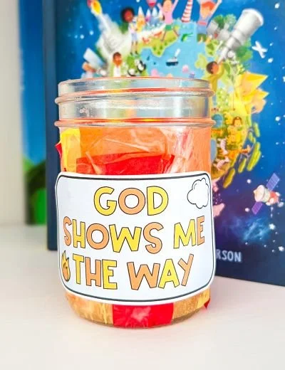In this craft, kids will use liquid glue to attach small pieces of tissue paper to a glass jar. Then have kids glue “God Shows Me the Way” onto the lantern. The template can be found in the New Year Bible Lesson for Older Kids.